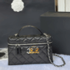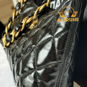 - Phần cứng: Các chi tiết kim loại màu vàng kim (Gold-Tone Metal) sáng bóng, bao gồm dây xích và logo CC ở mặt trước, tạo điểm nhấn nổi bật trên nền da đen.