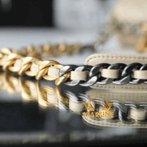 - Phần cứng (Hardware): Đây là điểm nhấn độc đáo với bộ ba kim loại: dây xích màu vàng, bạc và ruthenium. Sự kết hợp này mang đến vẻ ngoài cá tính, nổi bật, khác hẳn với các mẫu túi Chan truyền thống. Logo CC lồng vào nhau ở khóa túi được cách điệu lớn hơn, được bọc da tinh tế và là dấu ấn không thể nhầm lẫn.