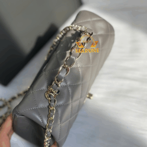 - Phần cứng: Khóa cài và dây đeo được làm từ kim loại cao cấp màu bạc (Silver) sáng bóng, tạo điểm nhấn lấp lánh trên nền da xám. Phần tay cầm chắc chắn cùng dây đeo vai linh hoạt mang đến nhiều cách sử dụng, giúp bạn dễ dàng thay đổi phong cách.